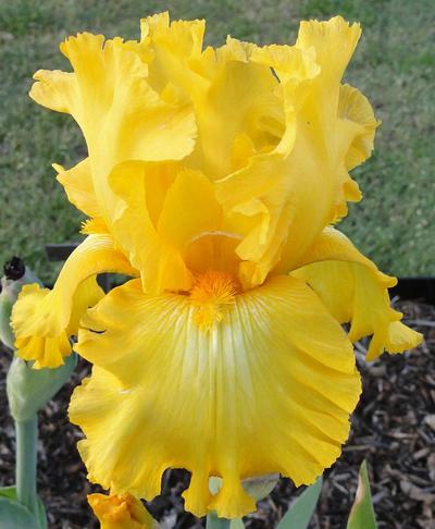 You're My sunshine-(Chun Fan-2011)-Tall Bearded Iris-36 Inches Tall-Medium Bloom Season-Ruffled gold self with faint white flash at the end of the gold beards. Extremely popular. Very good yellow.